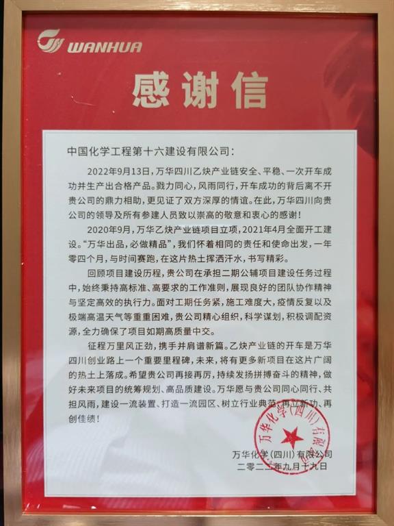 近日,由第三分公司承建的四川眉山万华项目获业主感谢信。信中对公司在工程建设上的高标准、严要求给予了充分的肯定,尤其是克服了高温和疫情等不利因素,充分展现了“六个特别”的铁军精神,体现了央企的责任与担当。
