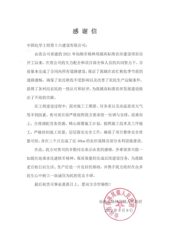 9月9日,仙桃市杨林尾镇人民政府对第一分公司承建的仙桃市杨林尾镇高标准农田改造建设项目发来感谢信。