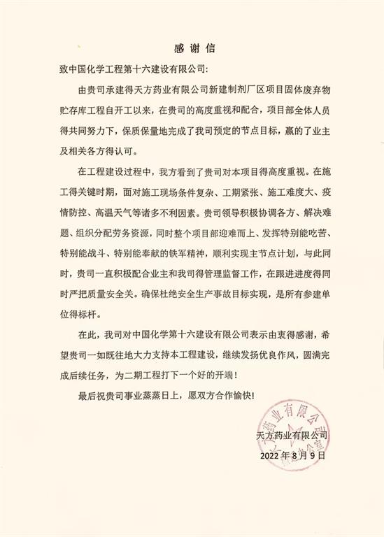 近日,武汉公司天方药业项目收到来自天方药业有限公司发来的感谢信,信中对武汉公司进场以来的表现给予了充分的肯定和赞扬。